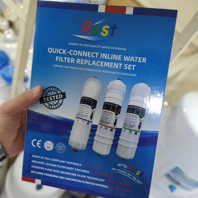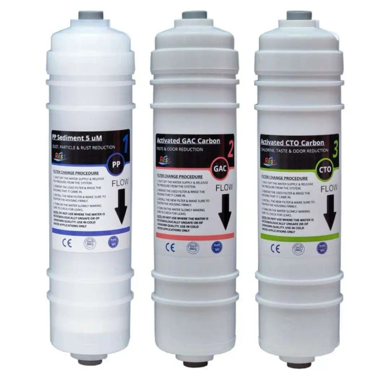 ست فیلتر پیش تصفیه اینلاین برند REST فیلتر الیافی (PP) فیلتر کربن پودری ( Carbon Active) فیلتر کربن بلاک ( Carbon Block)